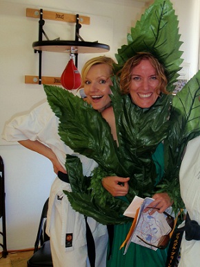 I was involved in the first part and taught the participants how to execute that combination. It consisted of a front snap kick, left jab to face, right punch to stomach, roundhouse kick, spinning back kick and a reverse punch! I had only 5 minutes to complete a short warm up and teach the combination! Crazy but it was fun!! Sounds easy but doing it over and over for hours….. drained me! Couldn’t imagine a better workout!! It wasn’t just me teaching all the time – we rotated but I’ve done it many, many times throughout the afternoon. I enjoyed it a lot because all the people coming in were full of energy and fun! Most of them had awesome costumes. Here is a picture with one of the participants dressed as a Marijuana leaf 🙂 Hilarious idea!